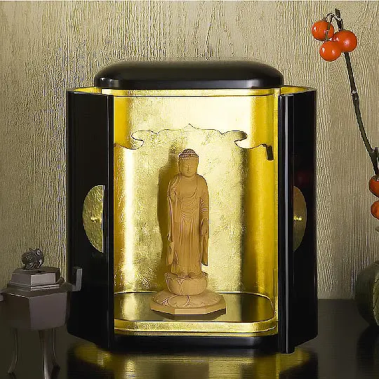 フォルムの中心に、金箔で月光をイメージしてデザインされた、現代のインテリア空間のモダンなアクセントとなる、シャープで美しい祈りの箱です。扉を開け正面の天蓋のシャープな雷文様の精緻なカットは、厨子仏壇のフォルムを美しく引き立てています。 天然杉の柾目を用いた本指物に本漆塗り真塗ツヤ仕上げ、本金箔仕上げです。 シンプルで木目の美しい白木、本格漆塗りの黒・朱・古代朱・ベージュ漆真塗り、モダンな質感の蒔き地漆塗りの6種類の仕上げでご用意しています。